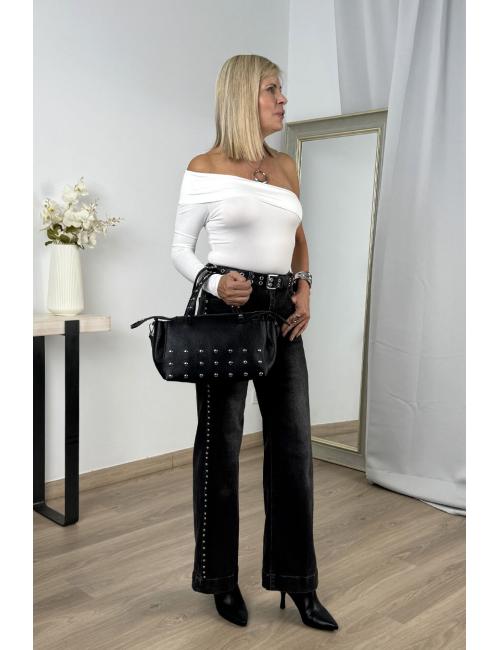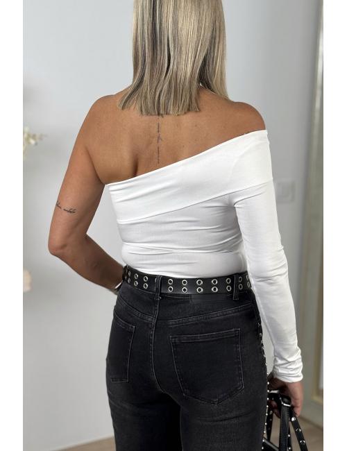 Body ajustado confeccionado en tejido tupido elástico. Es asimétrico, tiene una sola manga larga y el cuello vuelto. Cierre con botones metálicos a presión. Ideal para combinar con jeans y faldas, es una prenda cómoda y que estiliza tu figura.