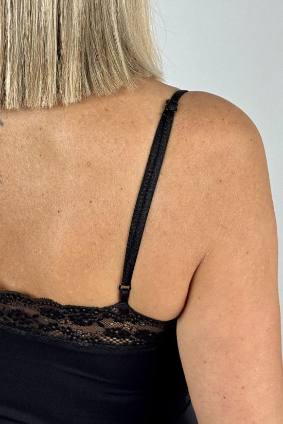 Body elástico confeccionado en tejido de raso elástico. Tirantes finos de altura regulable. Detalle de encaje en la parte superior, tanto delante como detrás. Escote en V y cierre en bajo con botones a presión.