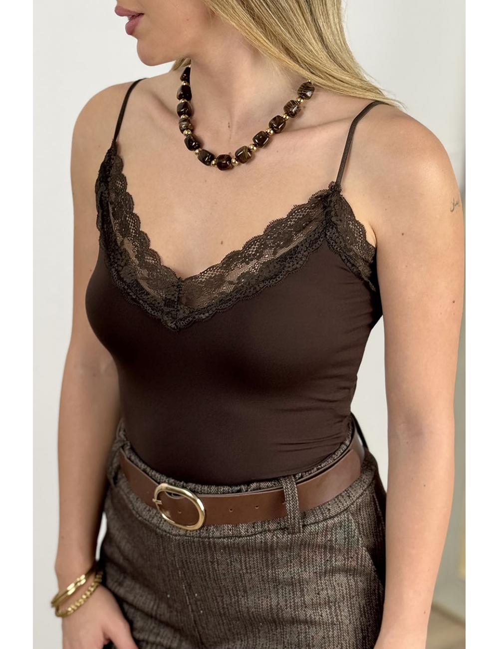 Body elástico confeccionado en tejido de raso elástico. Tirantes finos de altura regulable. Detalle de encaje en la parte superior, tanto delante como detrás. Escote en V y cierre en bajo con botones a presión.