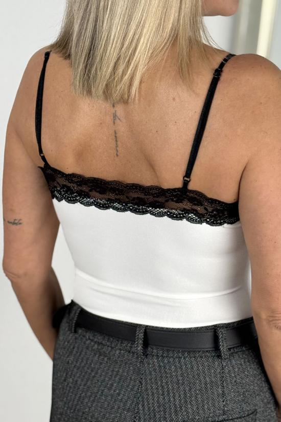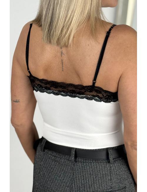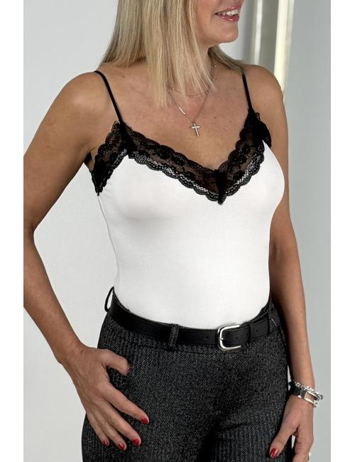 Body elástico confeccionado en tejido de raso elástico. Tirantes finos de altura regulable. Detalle de encaje en la parte superior, tanto delante como detrás. Escote en V y cierre en bajo con botones a presión.