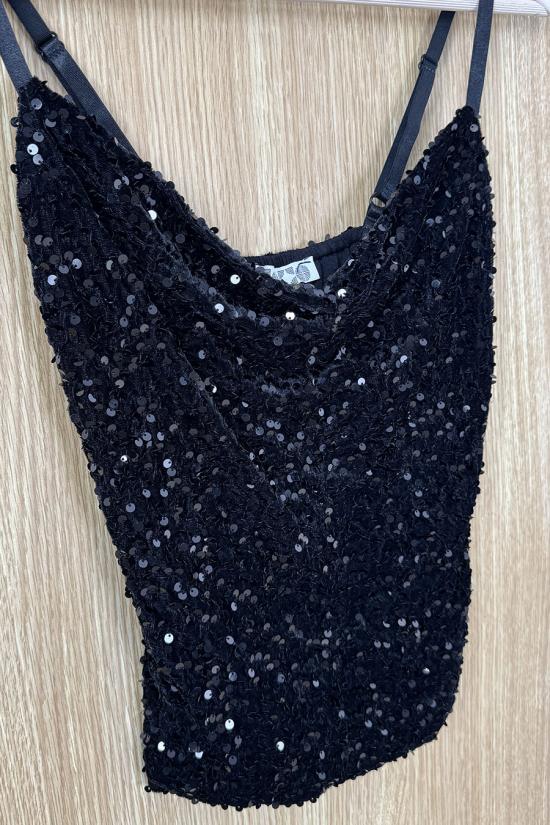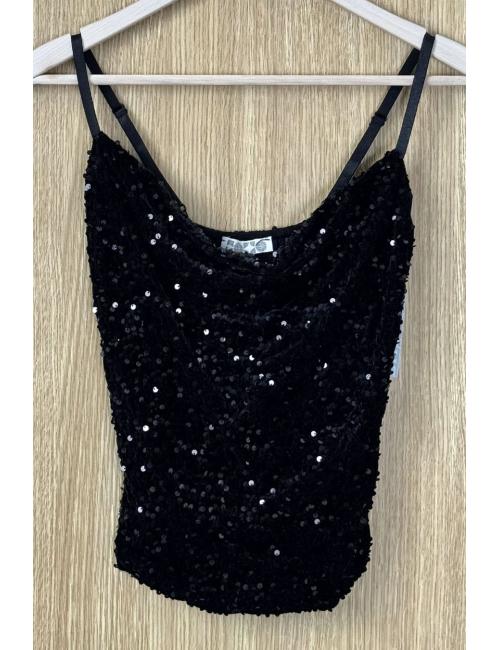Top de vellut cubierto de lentejuelas. Bajo recto y cuello con caída. Tirantes finos de altura regulable. Tu top de cabecera para estas Fiestas que podrás aprovechar el resto del año en eventos y celebraciones.