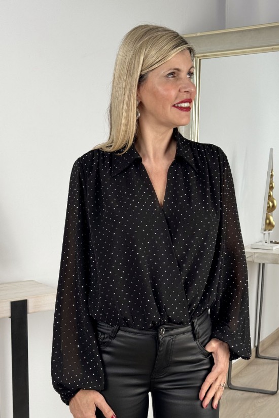 Body elástico confeccionado en gasa semitransparente. Cuello camisero y manga larga con goma en puño. Detalle de brillantitos repartidos por toda la prenda. Cierre en bajo con ganchitos metálicos y tres medidas para escoger.