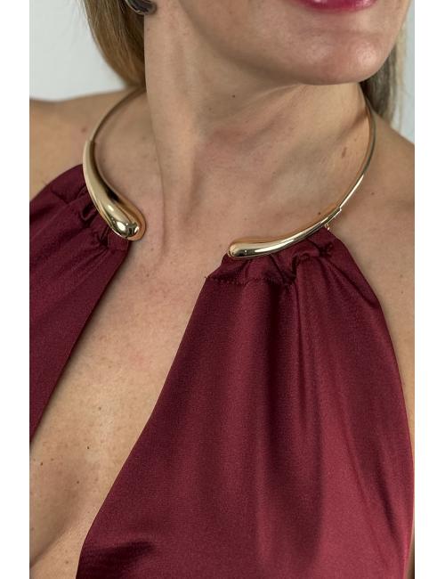 Body sin mangas confeccionado en tejido satinado brillante elástico. Detalle de collar asimétrico dorado en el cuello que sirve de sujeción. Abertura vestical delante y espalda descubierta.
