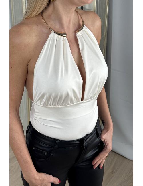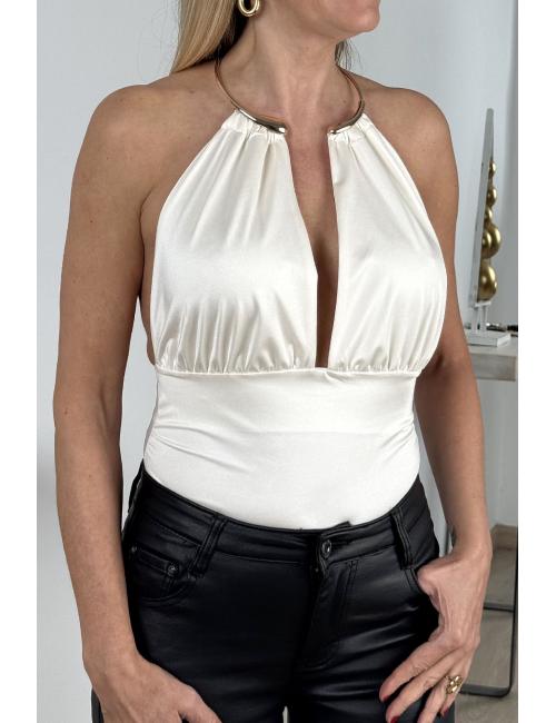 Body sin mangas confeccionado en tejido satinado brillante elástico. Detalle de collar asimétrico dorado en el cuello que sirve de sujeción. Abertura vestical delante y espalda descubierta.