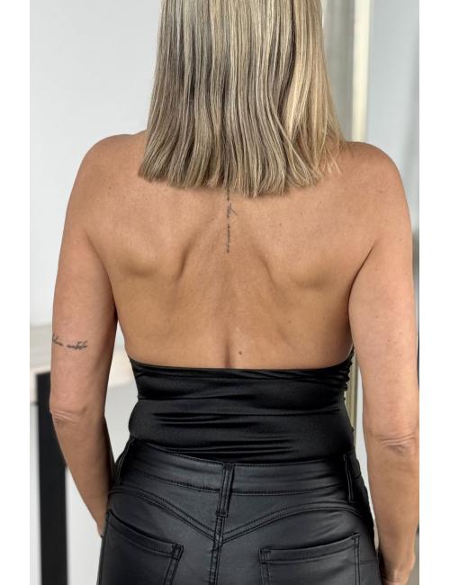 Body sin mangas confeccionado en tejido satinado brillante elástico. Detalle de collar asimétrico dorado en el cuello que sirve de sujeción. Abertura vestical delante y espalda descubierta.