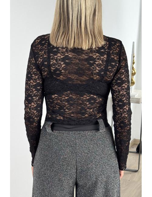 Camiseta manga larga de blonda elástica con transparencias y cuello perkins. Dale un toque estiloso y elegante a tu outfit con esta prenda que aprovecharás el resto del año para ocasiones especiales.