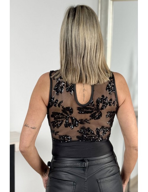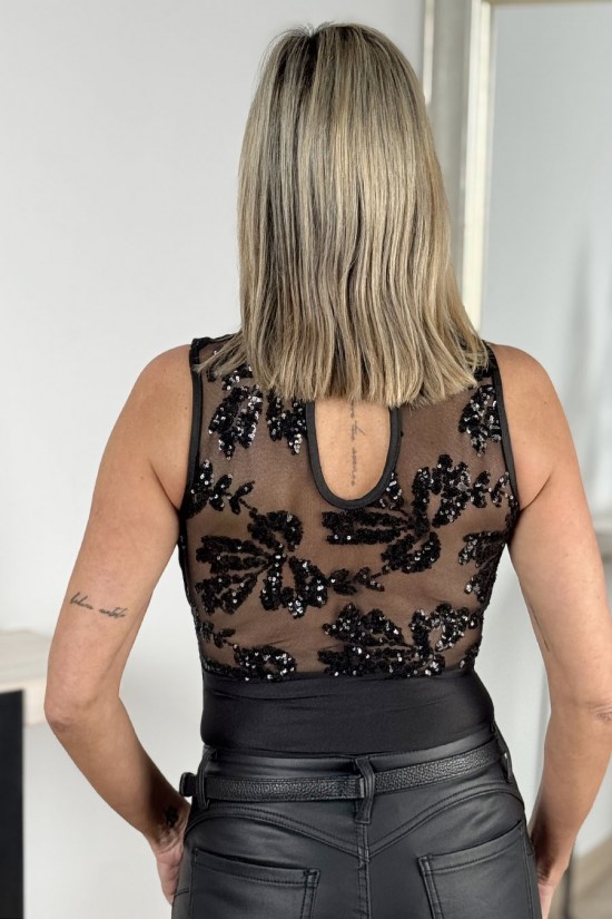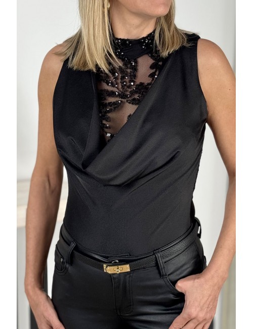 Body sin mangas confeccionado en tejido satinado brillante elástico y tul semi transparente con lentejuelas. Escote cascada y cuello halter atado detrás con dos botones. Detalle de pequeña abertura en la espalda.