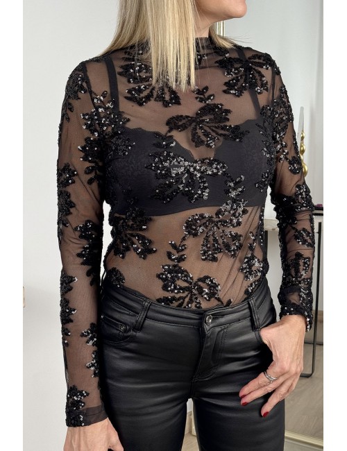 Camiseta de manga larga confeccionada en tul y lentejuelas. Cuello hálter.
