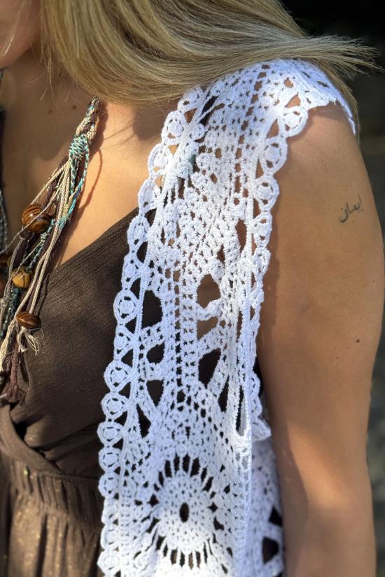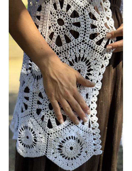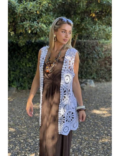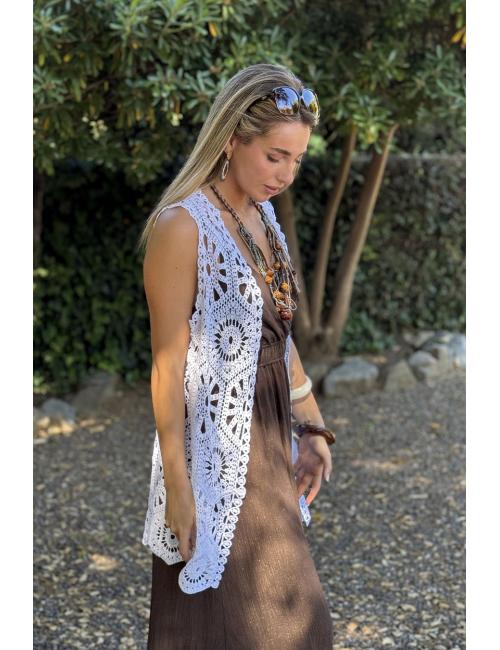 Chaleco de ganchillo largo tres cuartos. Abierto sin botones. Con dibujo en forma de mandalas y terminado en picos.