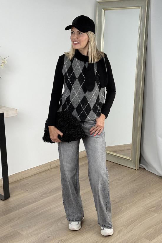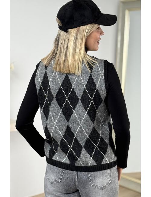 Chaleco de punto con estampado de rombos en tonos negro, gris y líneas finas a contraste en color blanco. Corte recto y cuello redondo con detalle de lazo del mismo tejido. Ideal para llevar con camiseta básica debajo o para superponer sobre camisas o vestidos.