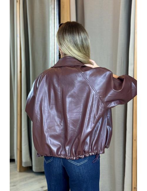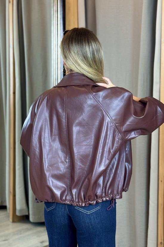 Chaqueta oversize efecto piel con cuello camisero y mangas anchas. Bajo recto ajustable con tankas para un ajuste personalizado. Cierre con cremallera y dos bolsillos laterales.