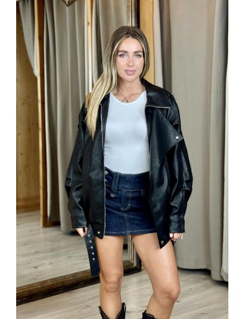 Chaqueta oversize efecto piel texturada con cuello camisero y mangas anchas. Bajo recto con detalle de goma elástica ancha y cinturón para un mejor ajuste. Detalles metálicos plateados en cremallera, botones y hebillas. Cierre con cremallera y dos bolsillos laterales.