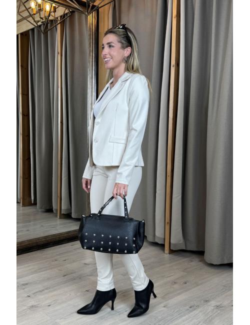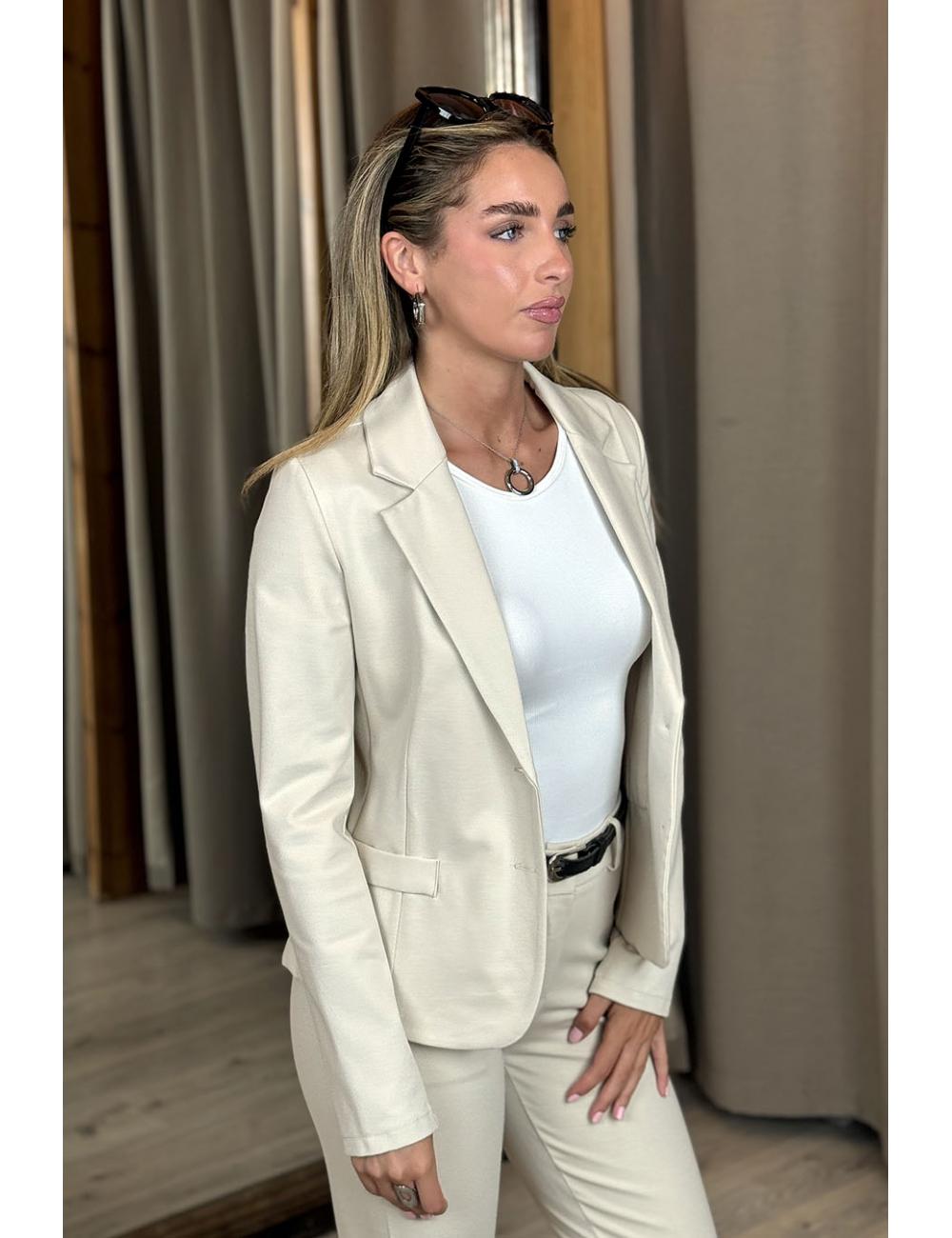 Americana confeccionada en tejido punto roma elástico. Entallada, 2 bolsillos laterales, cuello y solapa estilo sastre. Cierre frontal con dos botones anacarados.