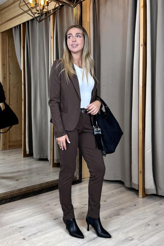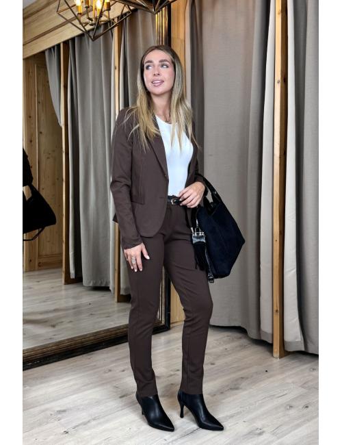 Americana confeccionada en tejido punto roma elástico. Entallada, 2 bolsillos laterales, cuello y solapa estilo sastre. Cierre frontal con dos botones anacarados.