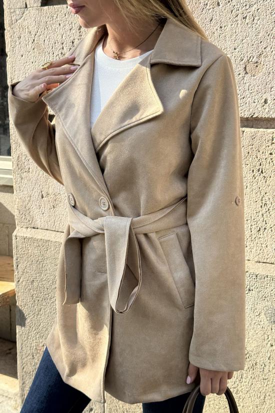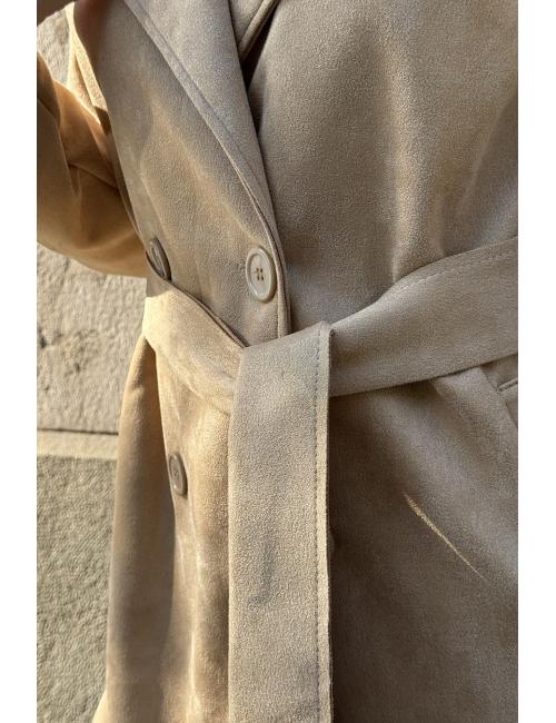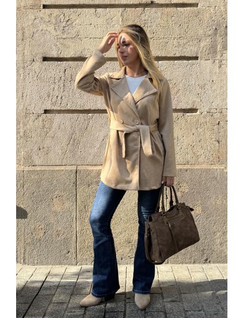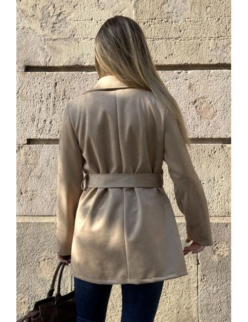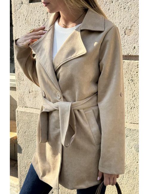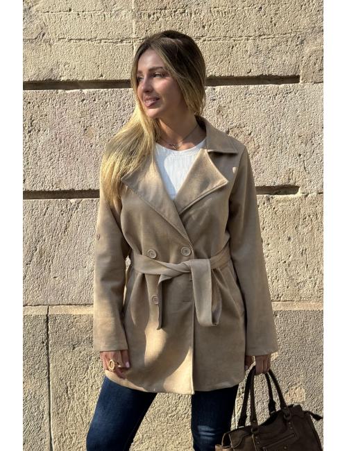 Trench corto con dos bolsillos laterales y cierre con cuatro botones, confeccionado en tejido de antelina. Manga larga con detalle de botón en el lateral. Incluye un cinturón y dos trabillas del mismo color y tejido.