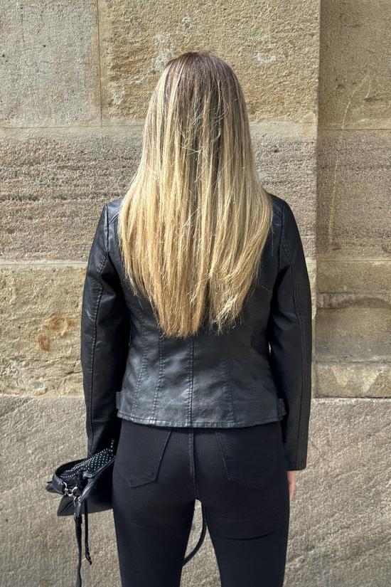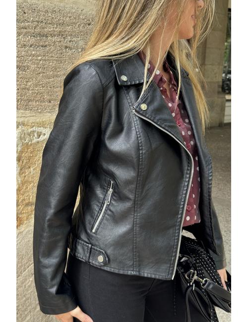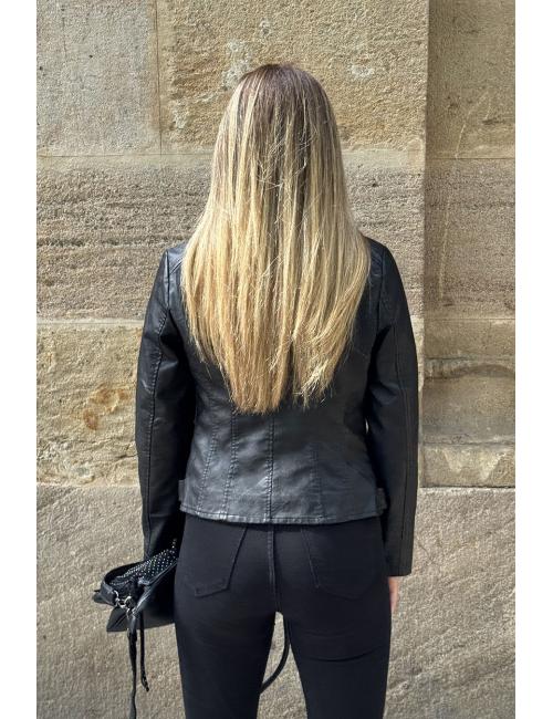 Chaqueta bíker de inspiración rockera confeccionada en piel sintética y cierre vertical con cremallera. Largo justo debajo de la cintura. Incluye bolsillos laterales con cremalleras y detalles de corchetes en solapas. Una chaqueta polivalente, versátil y combinable para tus looks con pantalones, faldas o vestidos.