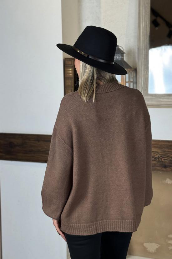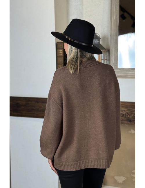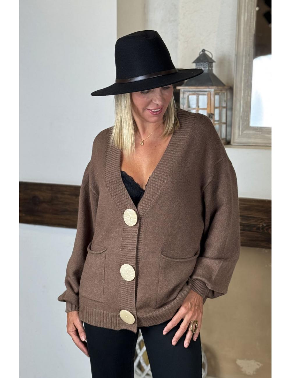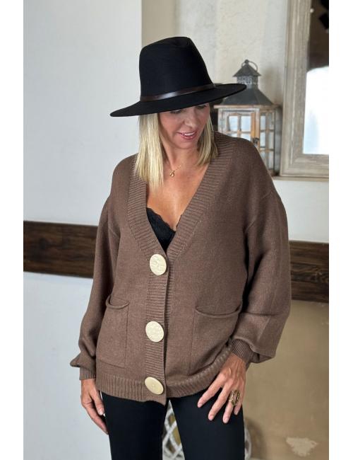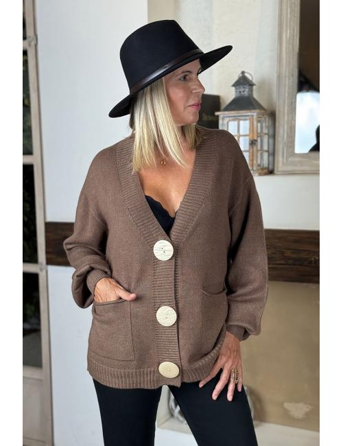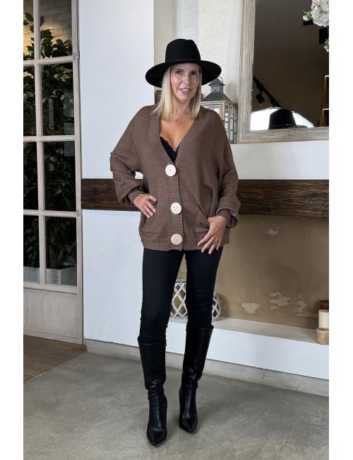 Chaqueta oversize confeccionada en punto fino. Cuello en V, dos bolsllos delante cierre delante con 3 botones grandes anacarados. Puños y cuello acabados en punto canalé.