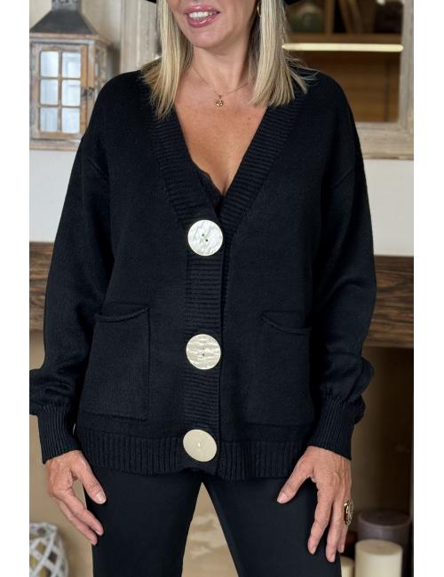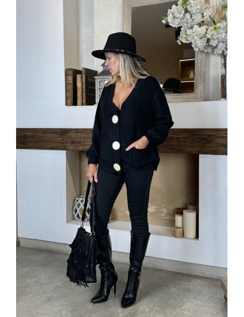 Chaqueta oversize confeccionada en punto fino. Cuello en V, dos bolsllos delante cierre delante con 3 botones grandes anacarados. Puños y cuello acabados en punto canalé.
