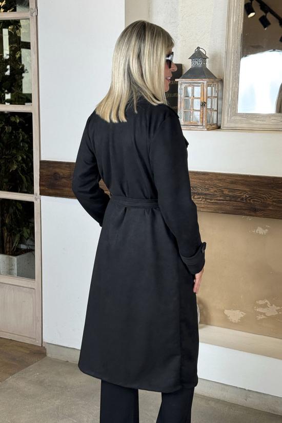 Trench largo confeccionado en antelina con dos bolsillos laterales y cierre con cuatro botones. Manga larga con detalle de tira en puño con botón. Incluye un cinturón y dos trabillas del mismo color y tejido.