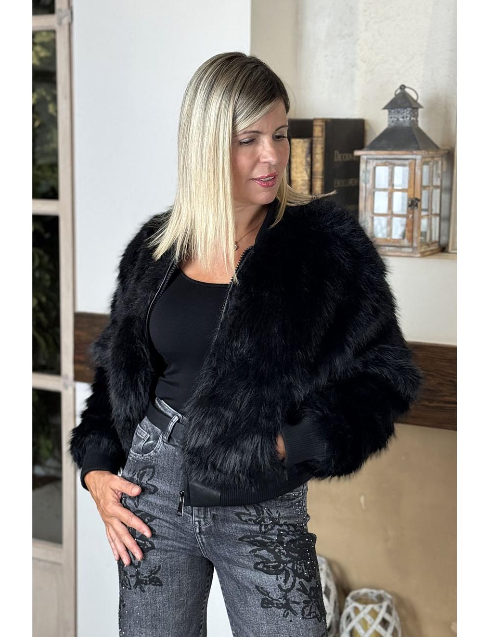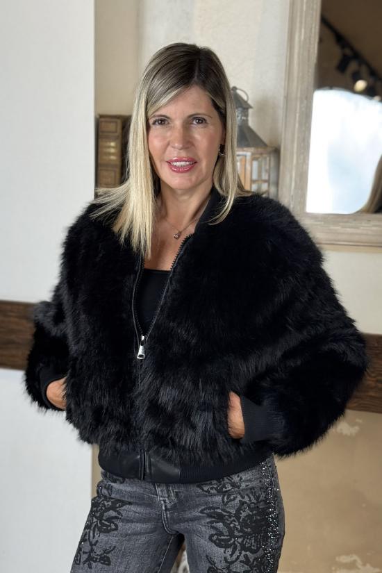 Cazadora bomber confeccionada con textil efecto pelo súper suave. Cuello redondo y puños acabados en punto canalé. Cierre delante con cremallera. Dos bolsillos laterales y forro de raso satinado interior.