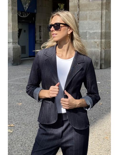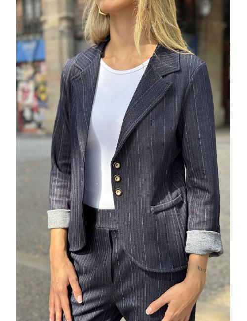Americana blazer confeccionada en tejido símil tejano con textura de espiga. Entallada, 2 bolsillos laterales, cuello y solapa estilo sastre. Cierre frontal con 3 botones anacarados.