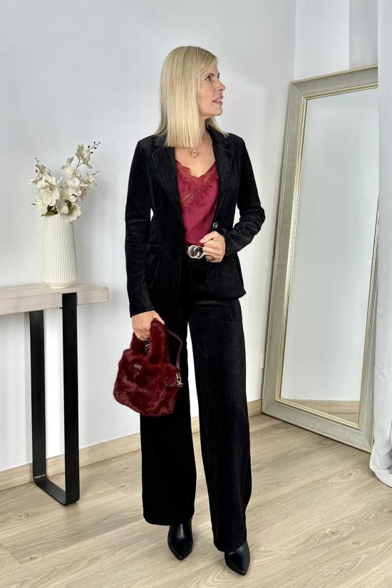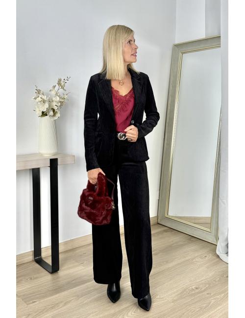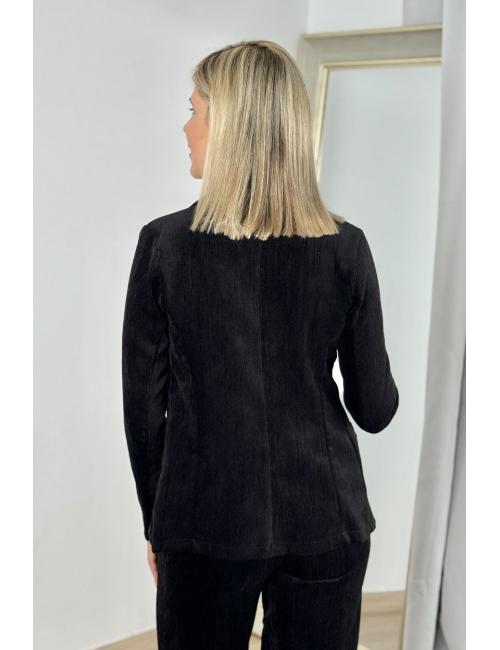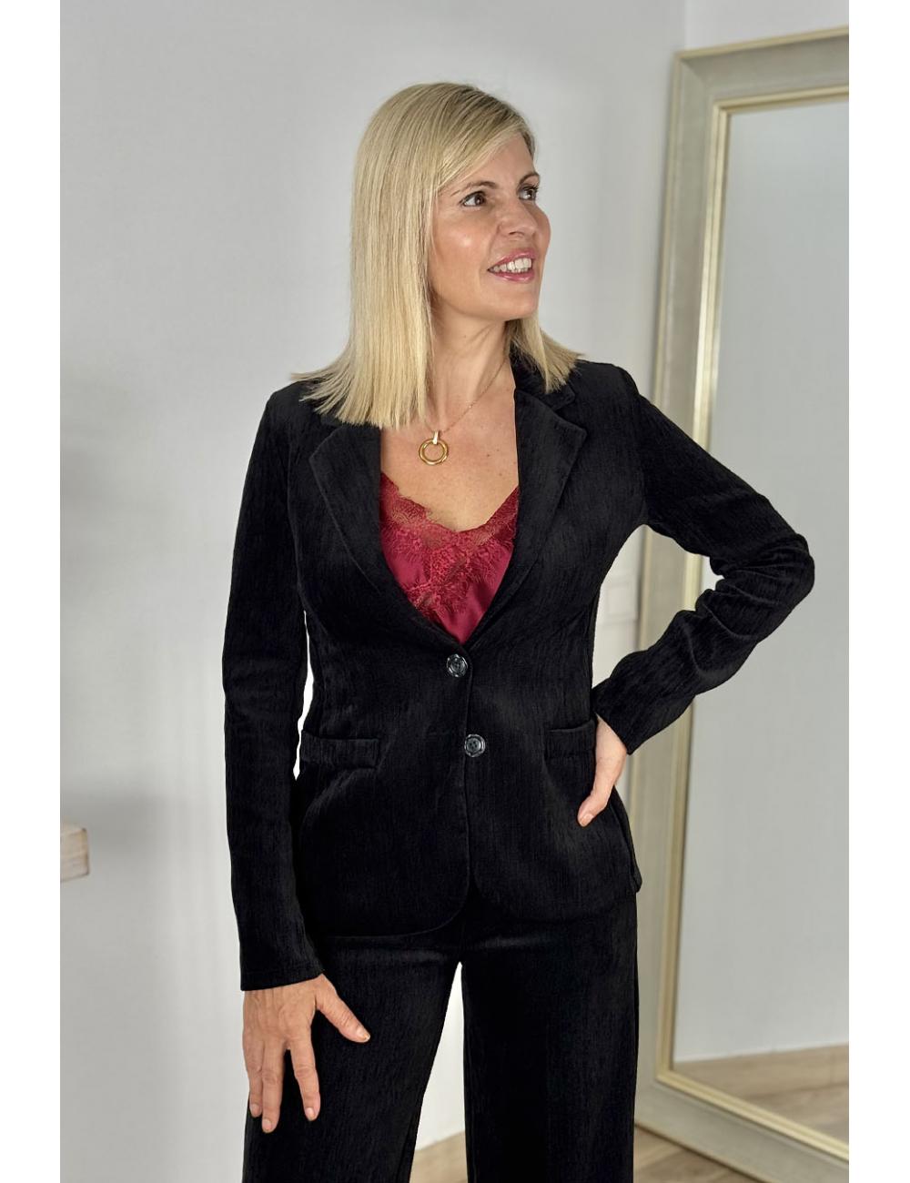 Americana confeccionada en tejido aterciopelado. Corte entallado, solapa sastre, forro interior y cierre frontal con dos botones anacarados. Incluye dos bolsillos frontales decorativos con tapetas. Una blazer diferente y estilosa, ideal para tus looks de diario y de fin de semana.