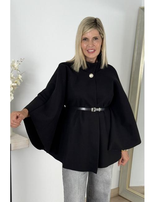 Poncho confeccionado en paño que incluye un cinturón fino de polipiel con hebilla metálica, para un mejor ajuste y sujección en la cintura. Detalle de botón gold grabado con ojal para cierre en la parte superior. Una prenda de abrigo original y favorecedora, ideal para tus looks de diario y de fin de semana.