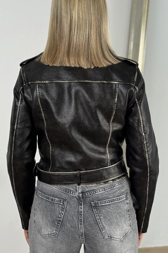 Chaqueta bíker de estilo rockero vintage, confeccionada en piel sintética efecto delavado y cierre vertical con cremallera. Detalle de cinturón con hebilla metálica. Largo justo debajo de la cintura. Incluye bolsillos laterales con cremalleras y detalles de corchetes en solapas. Una chaqueta polivalente, versátil y combinable para tus looks con pantalones, faldas o vestidos.
