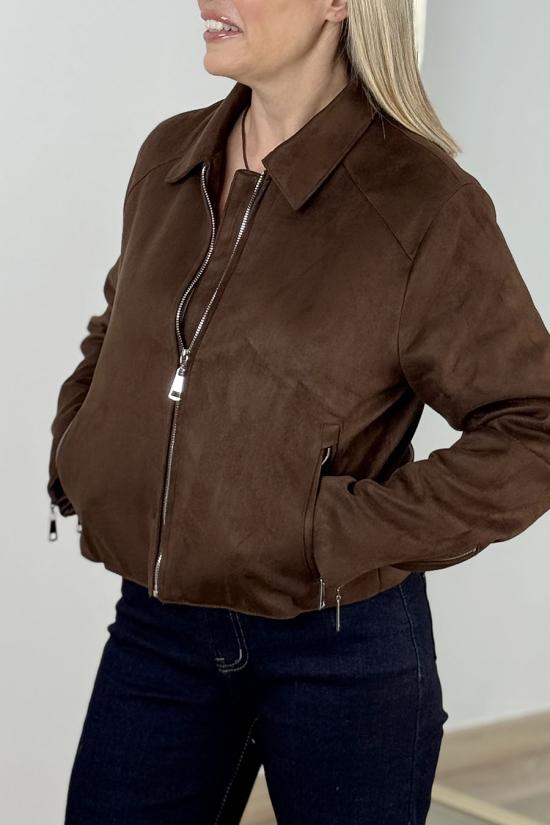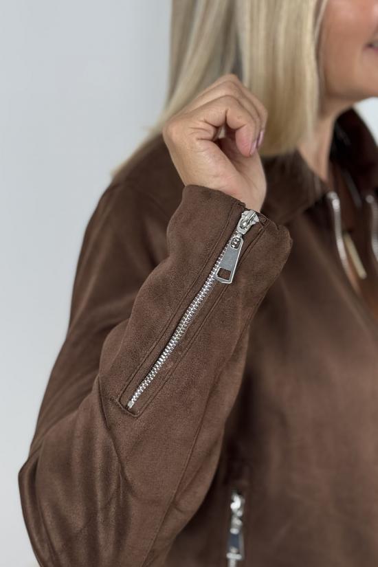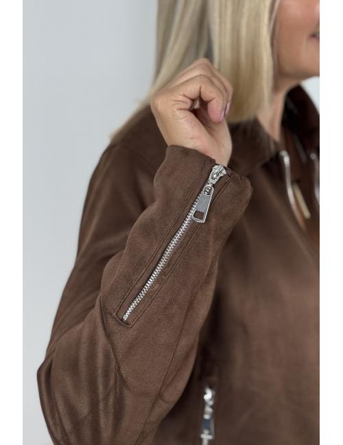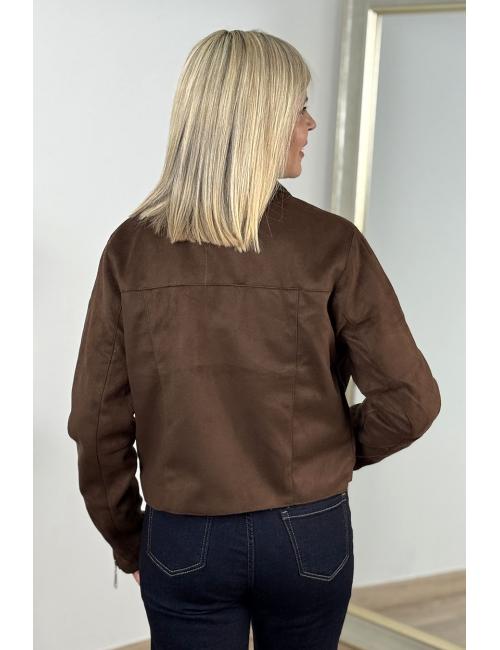 Chaqueta corta confeccionada en antelina marrón chocolate. Detalle de cremalleras en antebrazo, bolsillos y cierre. Espalda lisa y forro interior.