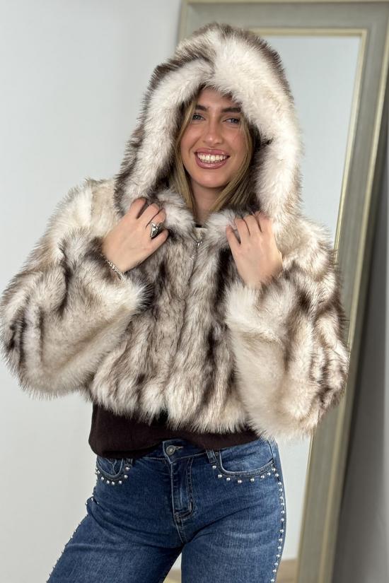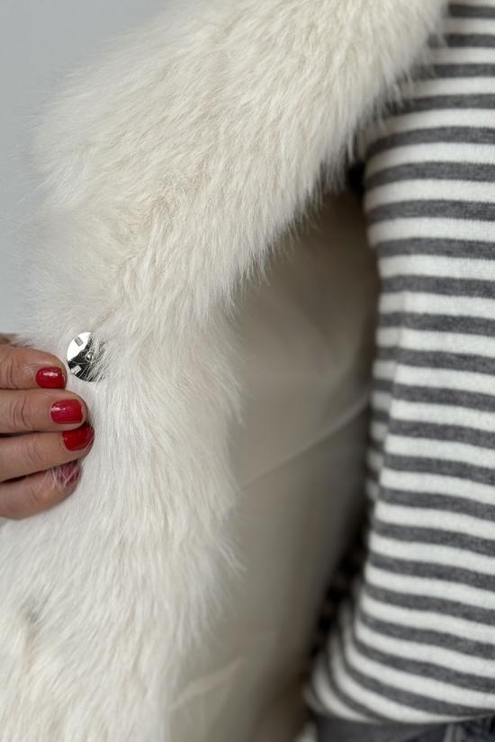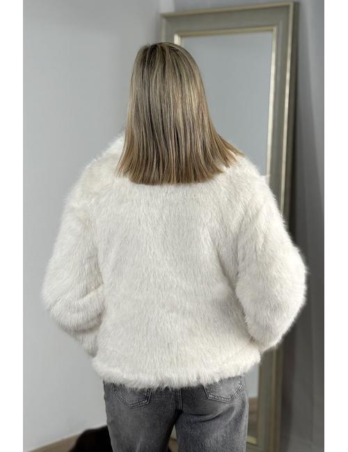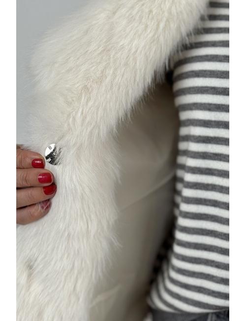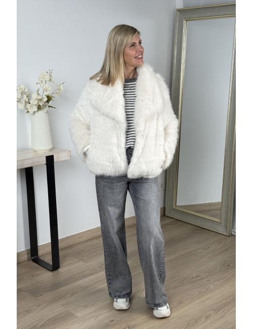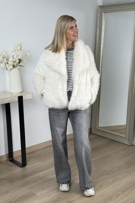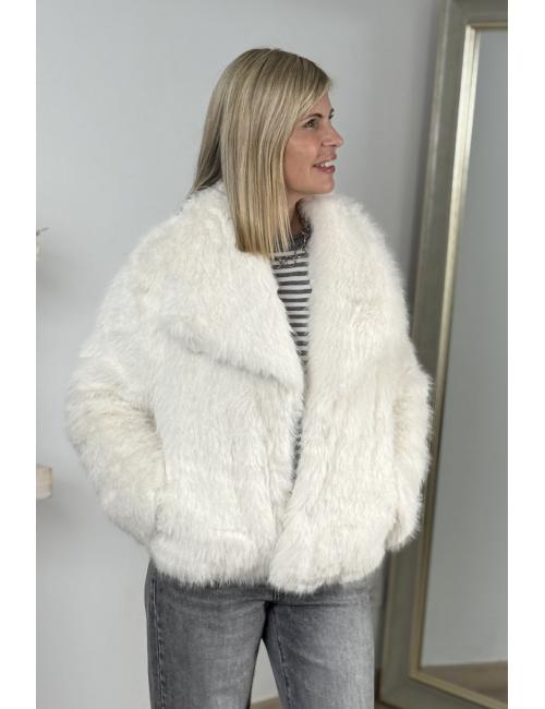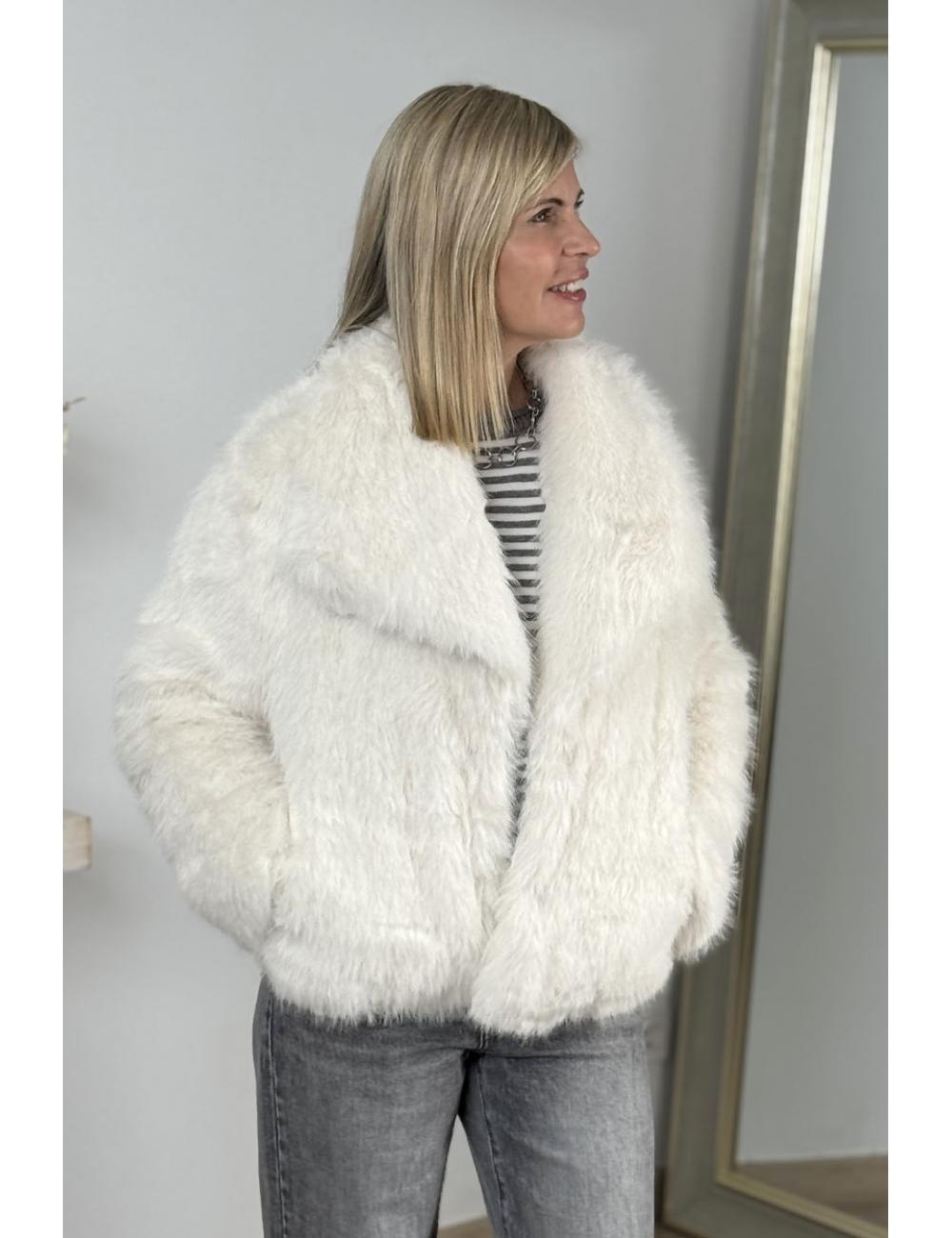 Chaqueta confeccionada con tejido de pelo sintético extremadamente suave. Cuello con solapa oversize, cierre delante con botón metálico magnético y dos bolsillos laterales. Detalle de forro de raso satinado interior.