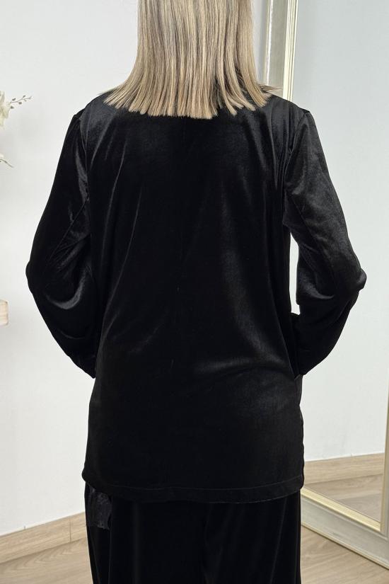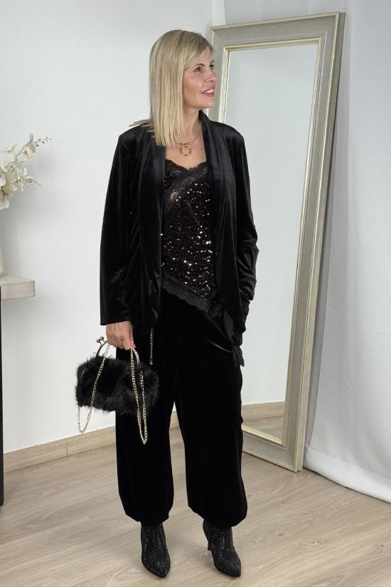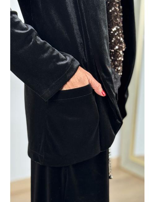 Americana básica sin botones y solapa delante. Confeccionada en tejido aterciopalado. Incluye dos bolsillos laterales.