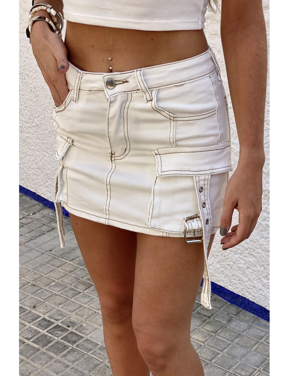 Falda cargo confeccionada en tejido denim elástico. Incluye un short fino debajo para que la lleves con total tranquilidad. Dos bolsillos delante y dos detrás más dos bolsillos delante en la parte inferior tipo cargo que llevan sus respectivos cinturones con hebilla.