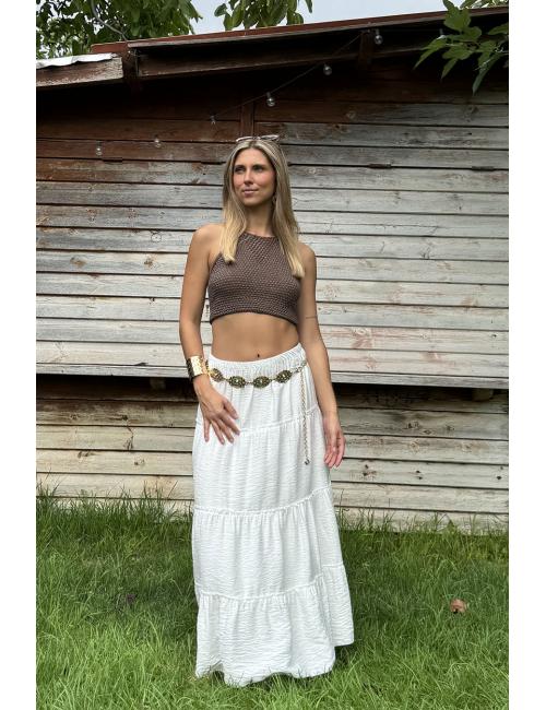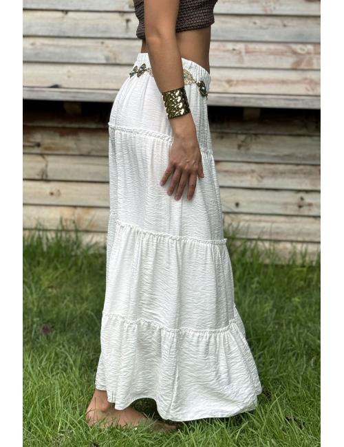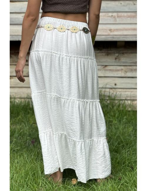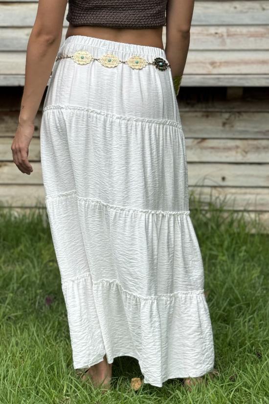 Falda larga ibicenca fluída con tres costuras horizontales. Incluye goma elástica en la cintura que la hace adaptable a varias tallas.
