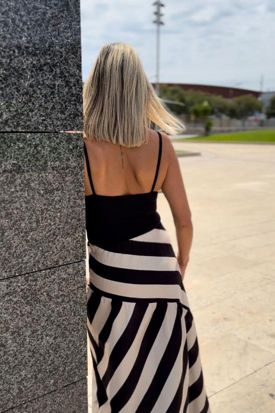 Falda larga fluída de corte evasé. Estampada a rayas anchas en diagonal. Goma en la cintura que permite adaptarse a varias tallas. Una falda estilosa, fresquita, diferente y divertida perfecta para tus looks de verano y entretiempo.