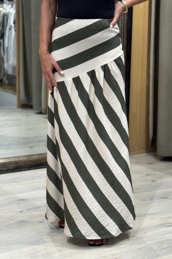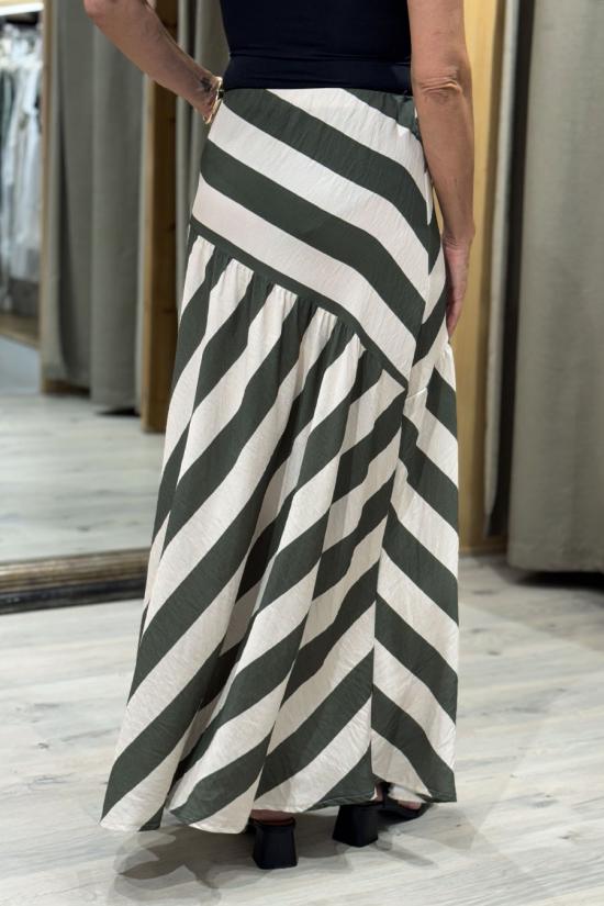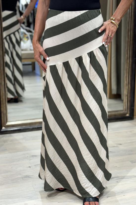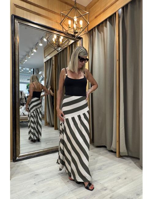 Falda larga fluída de corte evasé. Estampada a rayas anchas en diagonal. Goma en la cintura que permite adaptarse a varias tallas. Una falda estilosa, fresquita, diferente y divertida perfecta para tus looks de verano y entretiempo.