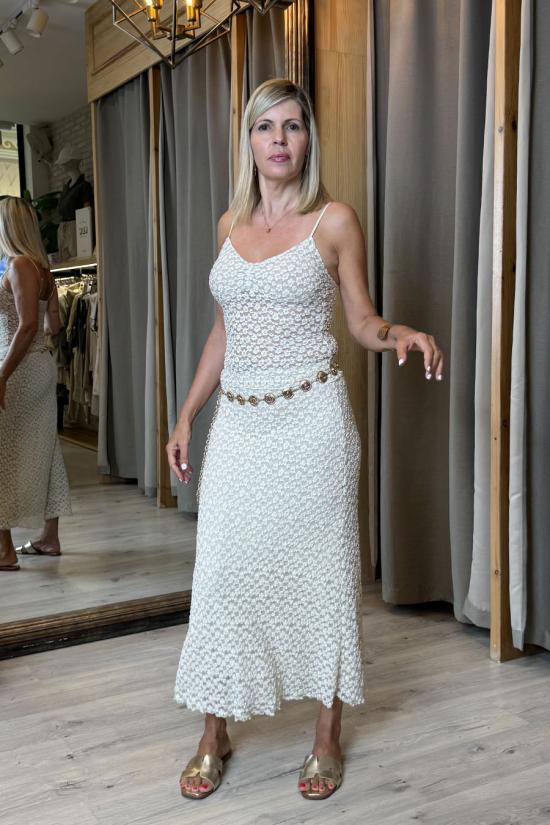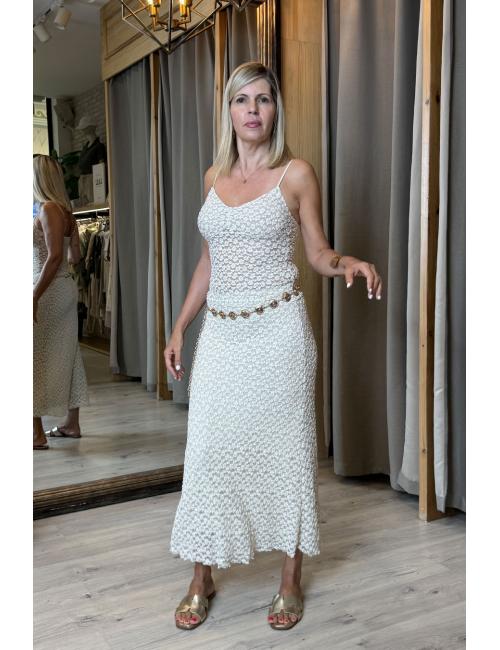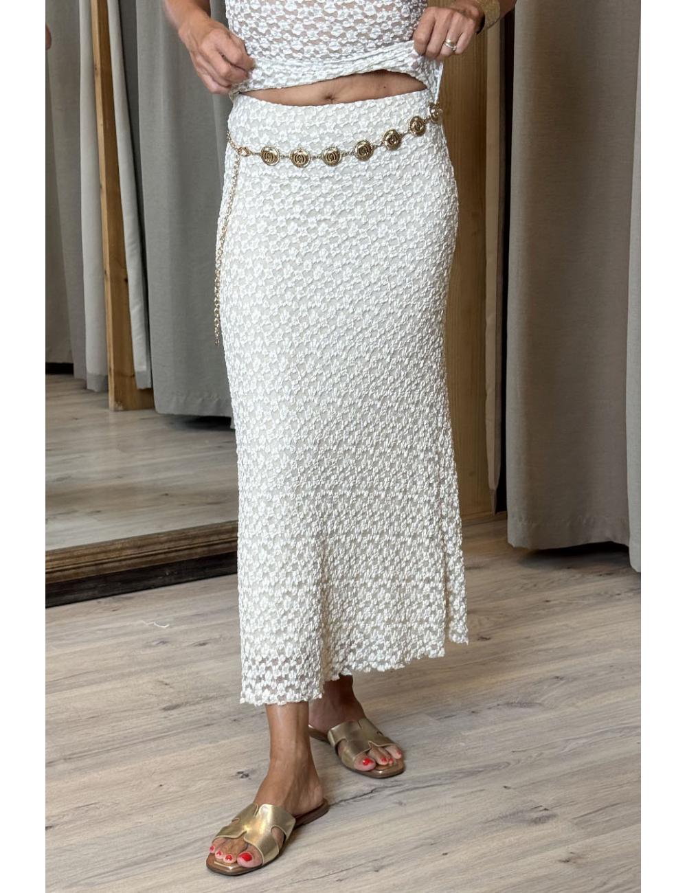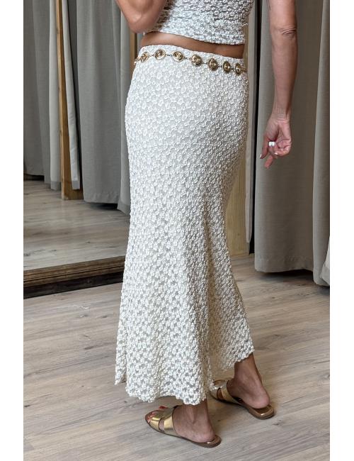 Falda larga maxi de corte evasé. Confeccionada con tul bordado. Goma en la cintura que permite adaptarse a varias tallas.