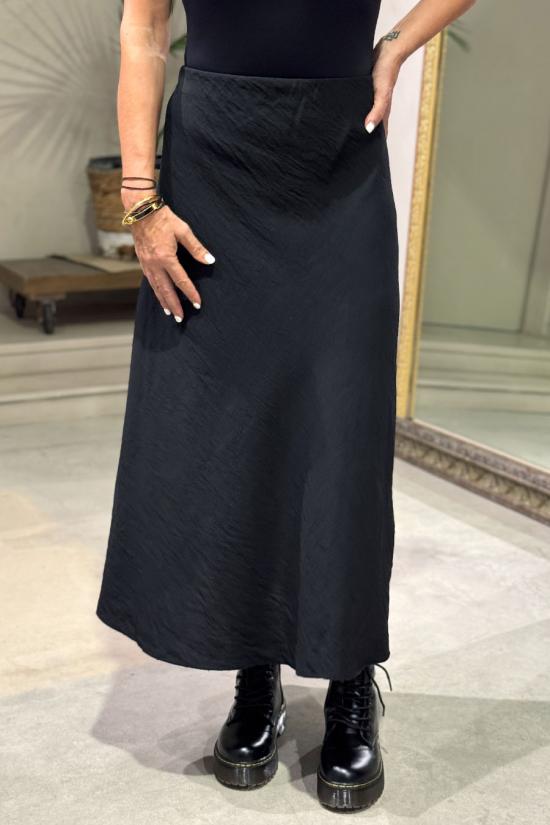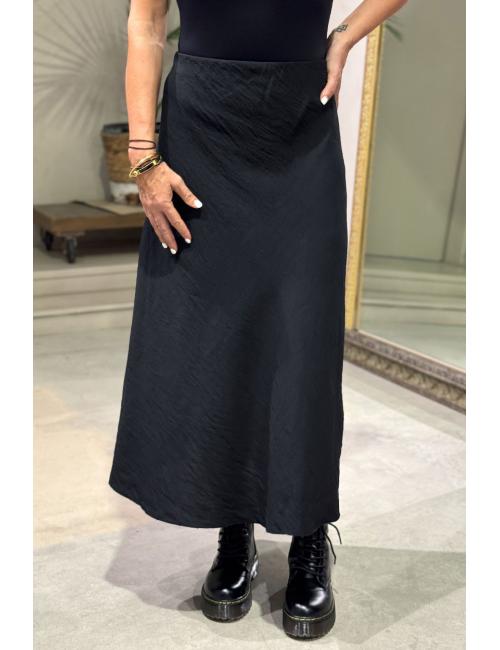 Falda larga midi confeccionada en tejido viscosa. Tiro alto y cintura elástica que la hace adaptable a varias tallas. Vuelo en bajo.
