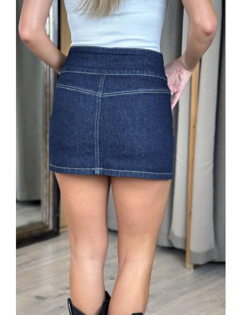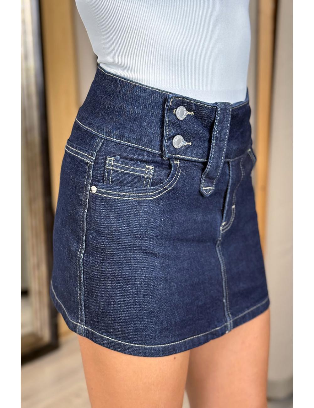 Minifalda tejana elástica de tiro alto con bóxer fino debajo. Detalle de trabilla extra-grande en cintura ancha. Tres bolsillos y cierre con dos botones y cremallera.