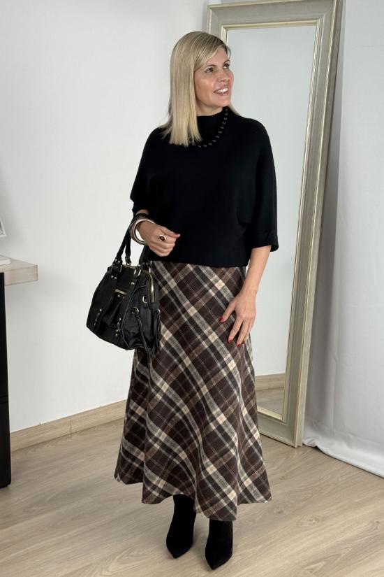 Falda midi estampada a cuadros de inspiración british en tonos tostados. Tiro medio y cintura súper elástica adaptable a varias tallas. Una falda de diseño tradicional, versátil y adaptable a tus looks de diario y de fin de semana.
