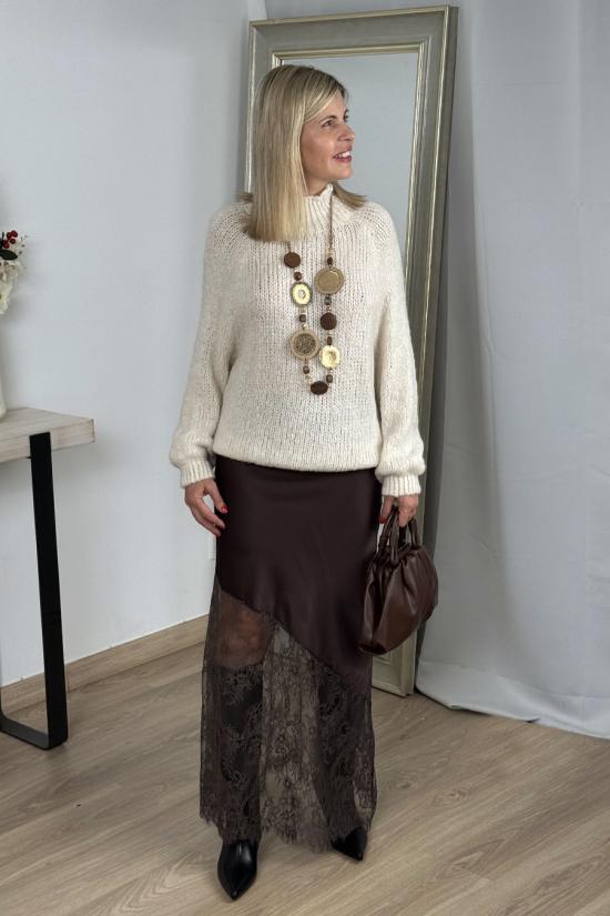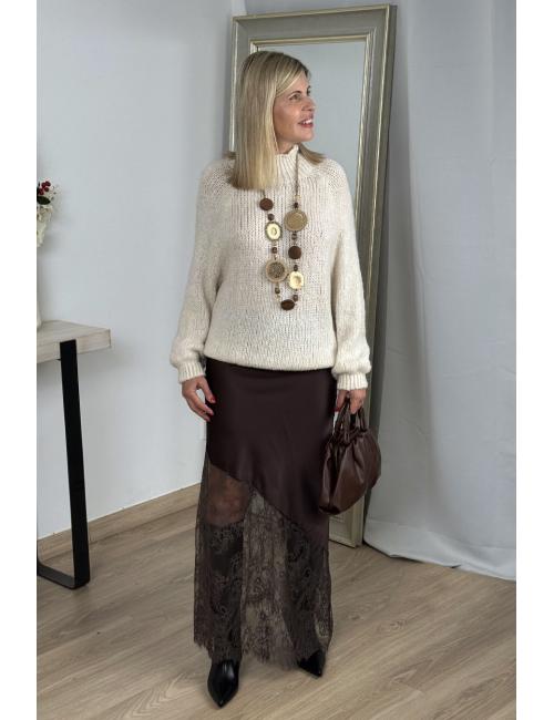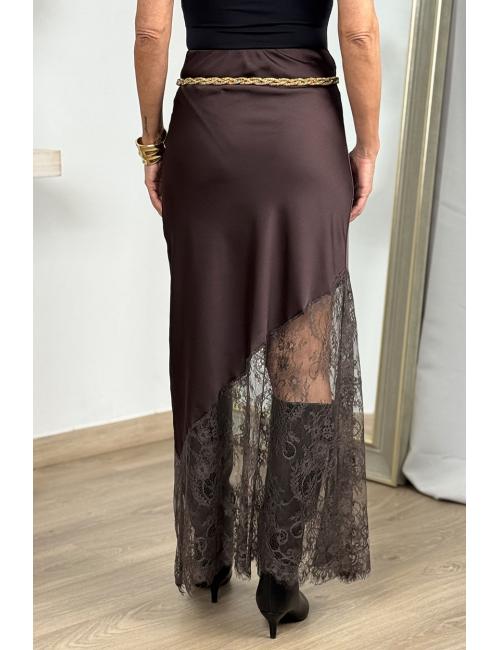 Falda midi lencera confeccionada en raso satinado y blonda. Corte en diagonal en la división entre los dos tejidos. Cintura elástica que la hace adaptable a varias tallas.