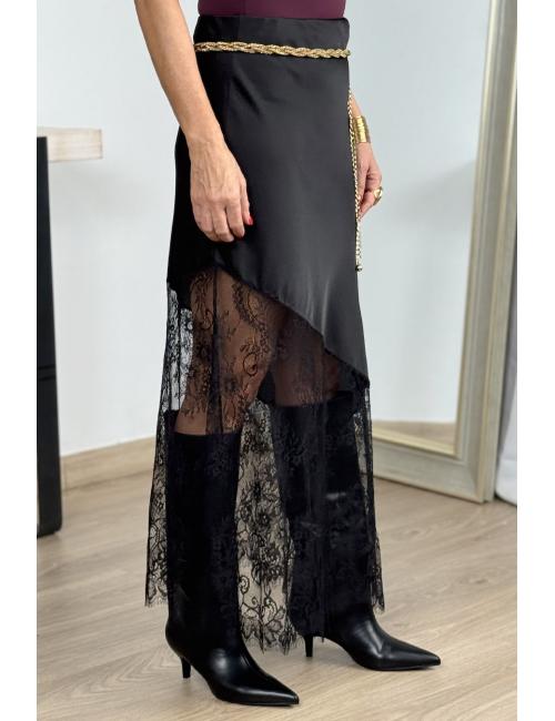 Falda midi lencera confeccionada en raso satinado y blonda. Corte en diagonal en la división entre los dos tejidos. Cintura elástica que la hace adaptable a varias tallas.