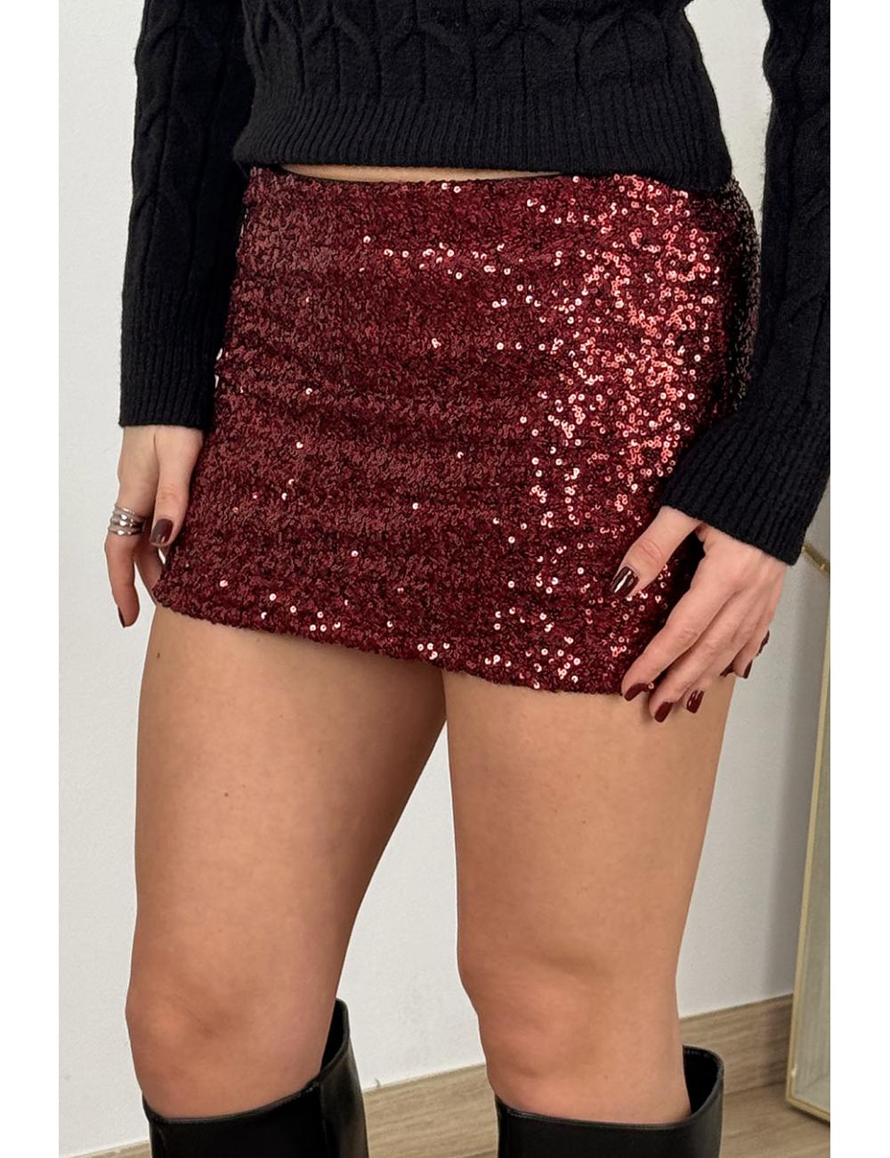 Falda mini elástica de lentejuelas. Corte recto y boxer interior de punto fino.