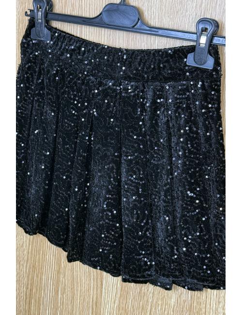 Falda corta plisada confeccionada en terciopelo combinado con lentejuelas. Cintura elástica y boxer interior de punto fino.
