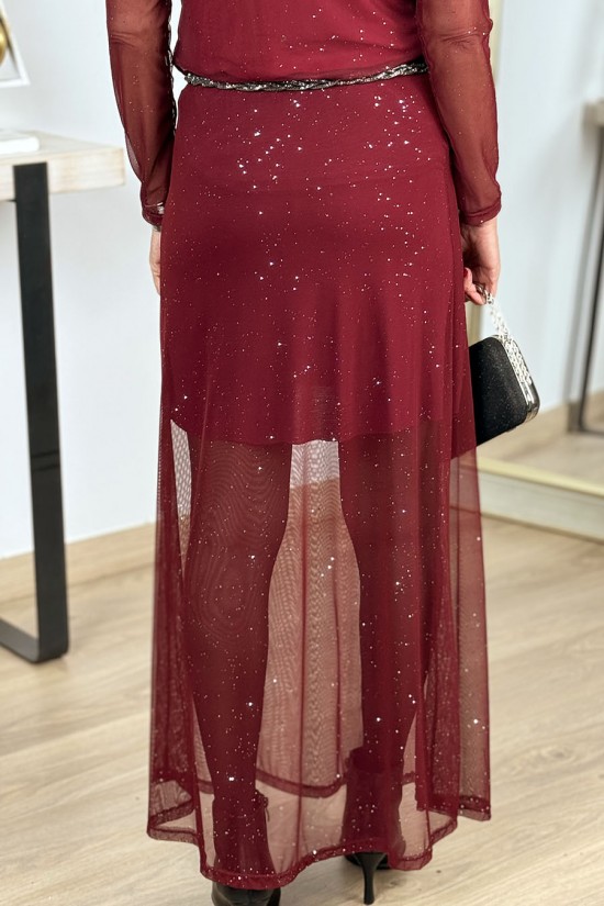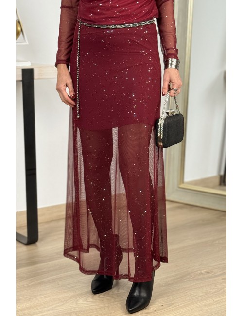 Falda larga de tul fluída con detalle de brillantitos repartidos por toda la prenda. Forro interior por encima de las rodillas. Cintura elástica que la hace adaptable a varias tallas.