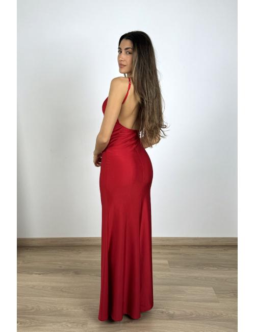 Vestido de lycra satinada brillante. Tejido elástico, largo y ceñido. Tirantes finos regulables en altura. Corte sirena con detalle de frunce en pecho y en la parte trasera. Tiene un amplio escote en la espalda. Escote en V. Un vestido especialmente indicado para eventos de tarde-noche o graduaciones.