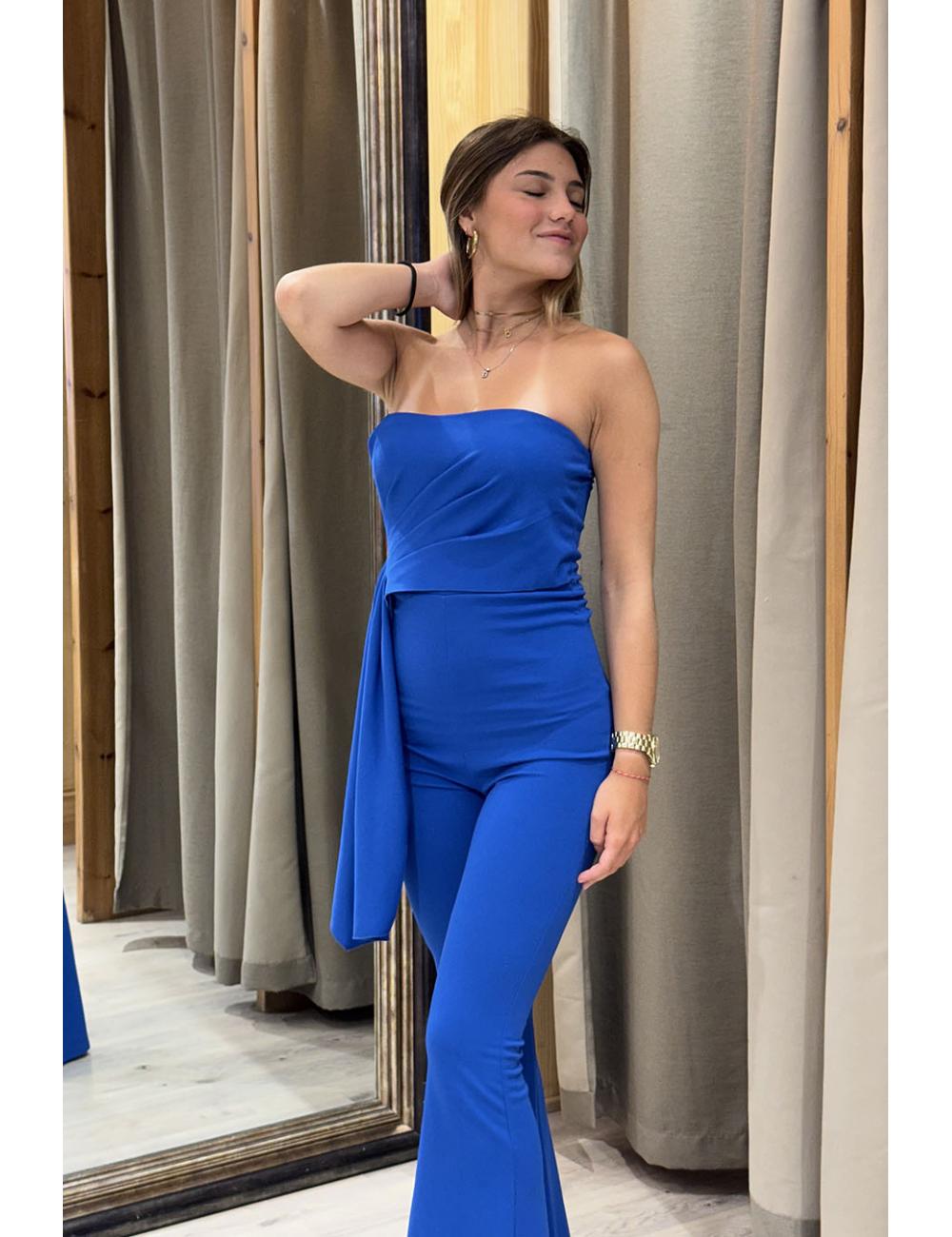 Mono largo ceñido elástico, sin mangas y escote palabra de honor. Pierna acampanada. Detalle fruncido en el escote del que parte una banda atada al lateral. Un mono que estiliza, ideal para tu evento o graduación.