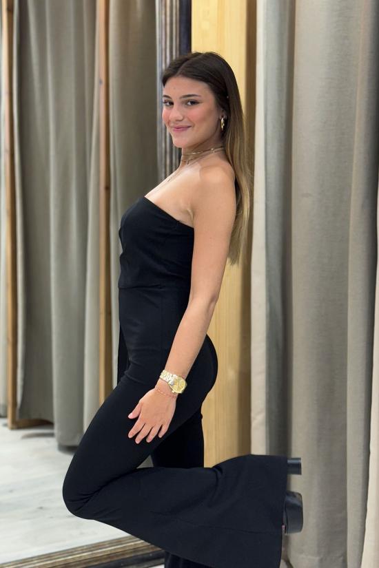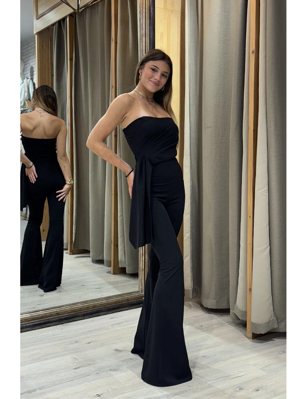 Mono largo ceñido elástico, sin mangas y escote palabra de honor. Pierna acampanada. Detalle fruncido en el escote del que parte una banda atada al lateral. Un mono que estiliza, ideal para tu evento o graduación.