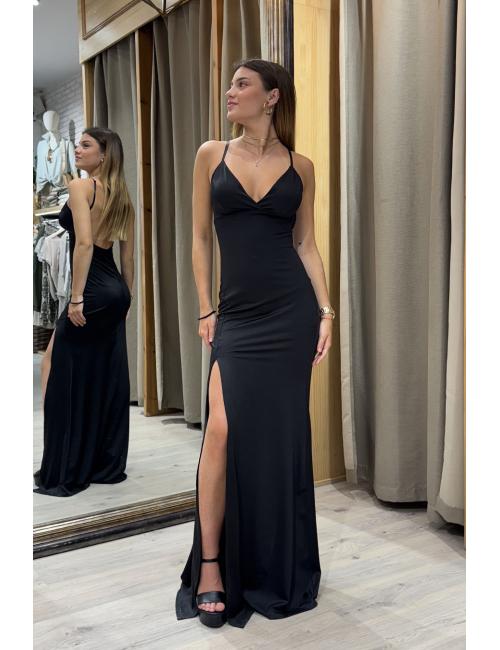 Vestido largo con tirantes finos regulables en altura para un mejor ajuste. Confeccionado con lycra brillante elástica. Silueta ceñida y escote en forma de V. Tiene copas en el pecho y la espalda descubierta. Un vestido sobrio y elegante, especialmente indicado para un evento especial o para tu graduación.