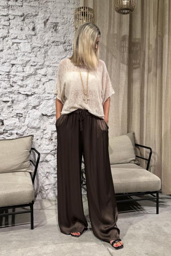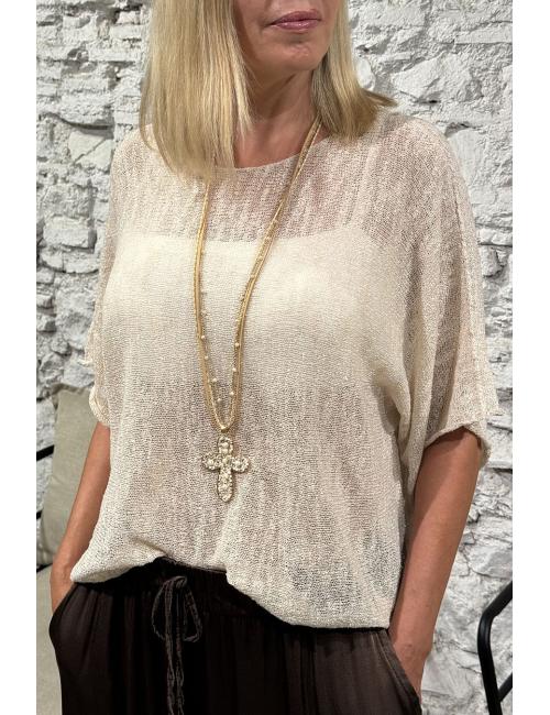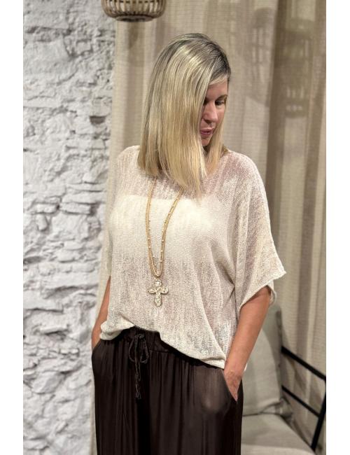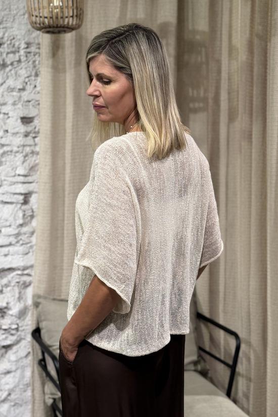 Jersey de manga corta estilo murciélago. Confeccionado en punto fino jaspeado semitransparente. Cuello semi-barca.