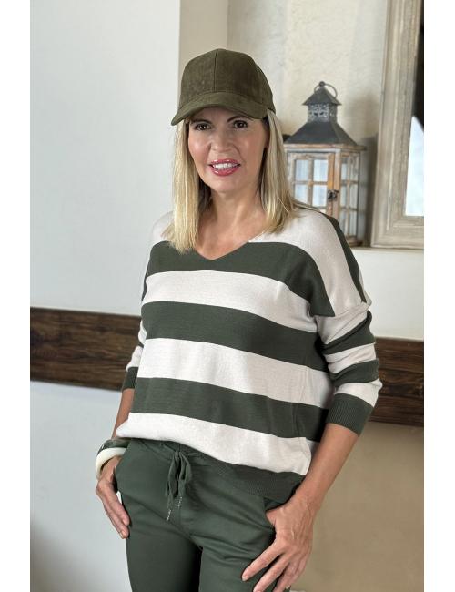 Jersey de punto fino estampado a rayas anchas horizontales a contraste. Cuello abierto en forma de pico y puños elásticos en canalé.